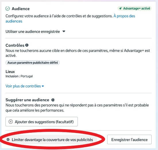 Meta permet de configurer une audience « suggérée » en plus de l’audience Advantage+.