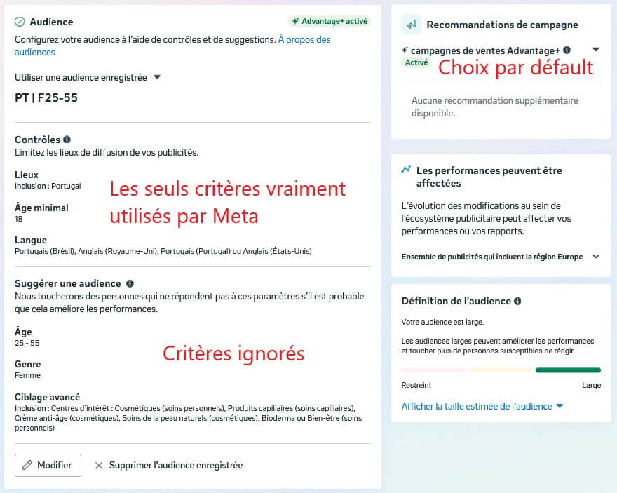 Problème : cette audience supplémentaire est rarement prise en compte par l’algorithme, qui privilégie systématiquement son propre ciblage automatisé. En d’autres termes, même si vous passez du temps à affiner votre audience, Meta va tout simplement l’ignorer.